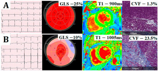 Illustrative comparison of cardiovascular imaging and histology data of two exemplar patients: electrocardiography (Column 1), global longitudinal strain (GLS; Column 2), matching native T1 (Column 3), and collagen volume fraction (CVF) in myocardial biopsies stained with Masson’s trichrome (Column 4). Patient without ECG changes (A) has preserved GLS, low native T1, and low histological fibrosis (CVF of 1.3%), whereas patient with ECG strain (B) has significantly reduced GLS, high native T1, and extensive histological fibrosis (CVF 23.5%).