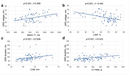 Correlations between QRS voltage and native T1 (a), LV ejection fraction (LVEF) (b), QRS duration and LV diastolic diameter (CMR) (c), and LV mass (CMR) (d).