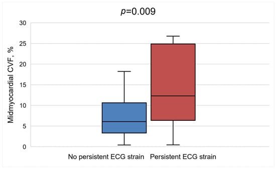 Further analysis revealed that patients with persistent ECG strain at 1 year following AVR had lower systolic and diastolic blood pressures (p = 0.017 and p = 0.040, respectively), greater QRS duration [102 ms (94–106.3) vs. 92 ms (86–101), p = 0.042], and more advanced heart failure, as evident by higher levels of BNP (p = 0.005) at baseline. These patients also had more advanced baseline LV remodeling, as they had greater LV mass (p = 0.023) and larger indexed LV end-systolic (p = 0.003) and LV end-diastolic (p = 0.010) volumes (Table 5). Furthermore, this group of patients showed worse baseline LV and right ventricle systolic functions, as they had significantly reduced GLS (p < 0.001), lower LVEF (p < 0.001), and lower right ventricle ejection fraction (p < 0.002). In regard to histological analysis, patients with persistent ECG strain had significantly more fibrosis in the midmyocardial layer on histological analysis (12.5 ± 9.9% vs. 7.3 ± 4.7%, p = 0.009) (Figure 4).
