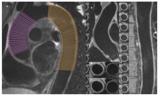 (A) An oblique sagittal ‘candy cane’ view of the thoracic aorta with marked cross-sections perpendicular to the vessel centerline that were used for aortic wall area measurement cross-sections. Example of ascending (B) and descending (C) aorta multiplanar reconstructed short- and long-axis cross-sections using a 3D turbo spin-echo black-blood sequence with a fat saturation impulse and (D) an example of short-axis cross-section with manually depicted wall delineation contours.