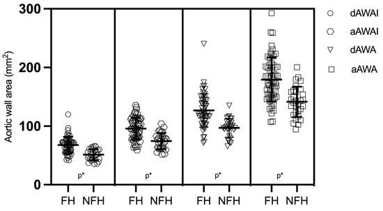Three-dimensional CMR aortic wall area in the FH and NFH subgroups. Abbreviations: p* < 0.001. FH = familial hypercholesterolemia, NFH = nonfamilial hypercholesterolemia, dAWAI = indexed descending aortic wall area, aAWAI = indexed ascending aortic wall area, dAWA = aortic wall area descending aorta, and aAWA = aortic wall area ascending aorta.