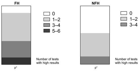Percentage of FH and NFH patients, with a high atherosclerosis result from 0, 1–2, 3–4, and 5–6 atherosclerosis tests (dAWAI, aAWAI, TCSdsc, TCSasc, CCS, and cIMT). Abbreviations: FH = familial hypercholesterolemia, NFH = nonfamilial hypercholesterolemia, p*—the percentage of patients with at least one high result FH vs. NFH (p < 0.001), patients with high results in 5 or 6 tests FH vs. NFH (p = 0.05).