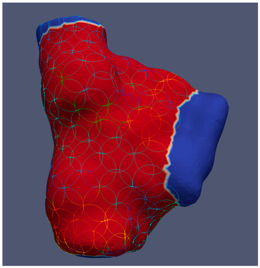 To compute local conduction velocities and voltage amplitudes from the measured activation times while considering the variability of wavefront directions, we defined circular areas with an approximately 5 mm radius on the map surfaces and left out the cutouts. We used spherical filters from ParaView (v.5.8.0 and 5.10.0, Kitware Inc., New York, NY, USA) to create circular areas on the curved heart surface [11,12], as shown in Figure 1. Additional simulations were created for each heart chamber, where the circles only cover the septal, lateral, posterior, or anterior region in the case of ventricles plus the superior of the atria, respectively.