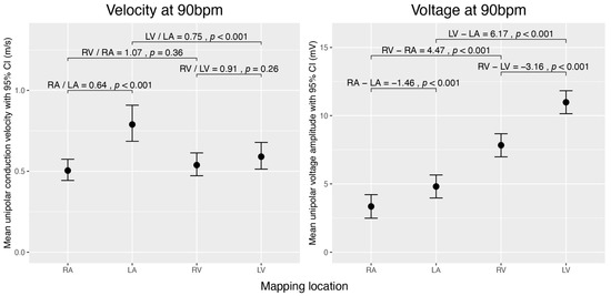 Comparison of estimated unipolar conduction velocities and voltage amplitudes during sinus rhythm across the cardiac chambers (RA, LA, RV, and LV) normalized to 90 bpm. The left graph displays mean conduction velocities (m/s), and the right graph shows mean voltage amplitudes (mV) with 95% confidence intervals. Brackets denote selected pairwise comparisons between chambers, with p-values testing if the ratio of mean velocities equals 1 or the difference in mean voltages equals 0 mV. The data were obtained using linear mixed-effects models and analysed using estimated marginal means. For velocity, we analysed the data on the log scale and then back-transformed the results for interpretation.