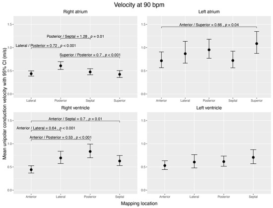 Visualization of estimated mean unipolar conduction velocities (m/s) during sinus rhythm, normalized to 90 bpm, across distinct regions of each cardiac chamber and their pairwise comparisons. The figure shows four subplots, each representing a cardiac chamber (right atrium, left atrium, right ventricle, and left ventricle), with potential mapping regions (anterior, posterior, lateral, septal, and superior). The 95% confidence interval is given for each mean velocity. Brackets highlight significant contrast ratios (p < 0.05) between the regions within the corresponding chamber, indicating divergence from a ratio of 1. The data were obtained using linear mixed-effects models and estimated marginal means. We conducted tests on the log scale and subsequently back-transformed the results for interpretation.