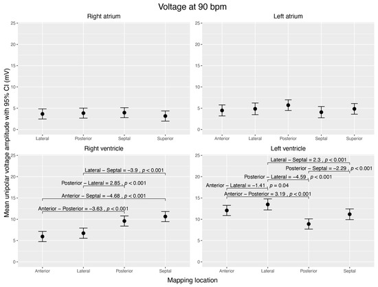 Visualization of estimated mean unipolar voltage amplitudes (mV) during sinus rhythm, normalized to 90 bpm, across distinct regions of each cardiac chamber and their pairwise comparisons. The figure shows four subplots, each representing a cardiac chamber (right atrium, left atrium, right ventricle, and left ventricle), with potential mapping regions (anterior, posterior, lateral, septal, and superior). The 95% confidence interval is given for each mean voltage. Brackets highlight significant voltage mean differences (Δ > 0 mV; p < 0.05) between the regions within the corresponding chamber. Data were derived from linear mixed-effects models with estimated marginal means.