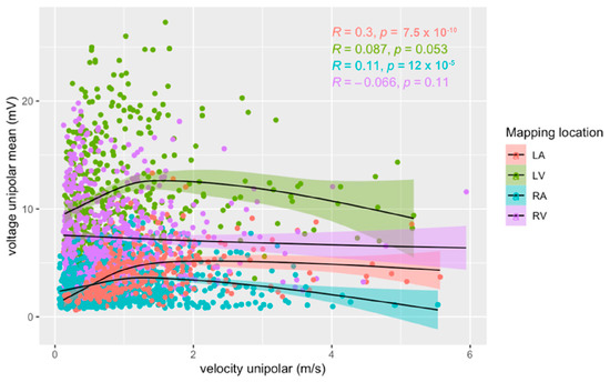 At velocities of <1.5 m/s, a low positive linear correlation between voltage amplitude and conduction velocity was observed in the LA (r(310) = 0.47, p < 0.001), LV (r(424) = 0.23, p < 0.001), and RA (r(1105) = 0.25, p < 0.001). No correlation was found in the RV (r(496) = −0.09, p = 0.05).