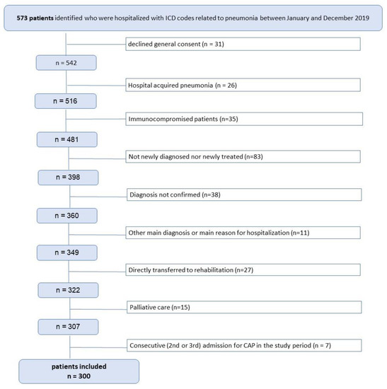 Our study was conducted in the cantonal hospital of Baselland (KSBL), a district general hospital covering a stable population of 280,000 in Northwest Switzerland. We undertook a retrospective cohort study extracting all patients older than 18 years of age who were admitted to the hospital between January and December 2019 and categorized them using an International Classification of Disease (ICD) code related to pneumonia (for more details, see the ICD codes list in the Appendix A). A total of 573 patients were identified.