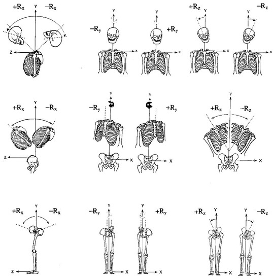 Rotational Components of Abnormal Body Postures. In each region (head, ribcage, and pelvis), six distinct rotation displacements are shown with “engineering” lines. Thus, 18 postural abnormalities as single postures are shown.