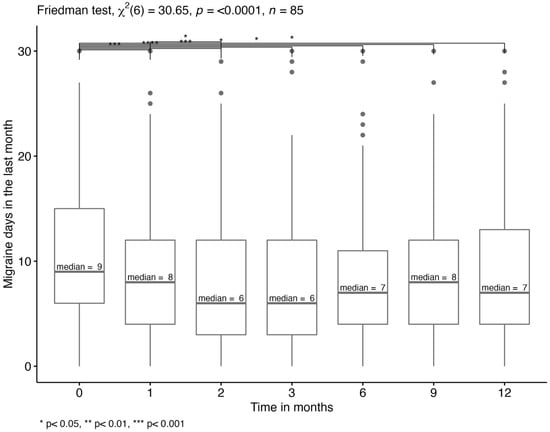 The median number of migraine days in the last month (monthly migraine days, MMD) over different timepoints were analyzed for patients with a complete data set regarding this variable (n = 85). According to the Wilcoxon rank test, there were significant differences in MMD between T0 and T1 to T6 and between T1 and T2 (p < 0.05). Thus, the MMD (IQR) significantly decreased from 9 (6, 15) to 6 (3, 12) within the first two months after treatment initiation and to 7 after one year of treatment (Figure 1).