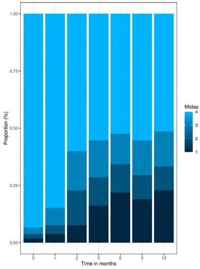 Patient-reported outcomes: MIDAS Score Time Series proportion barplot.
