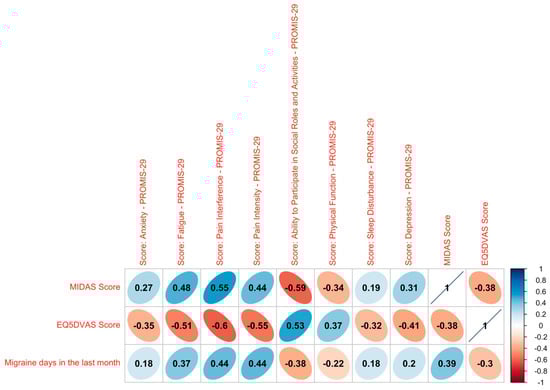 To visualize the relationship between the patient-reported outcomes themselves and the clinical marker of migraine days in the last month, a Spearman correlation was calculated (Figure 3). The MIDAS score shows a weak positive correlation with the migraine days in the last month and the EQ-5D-VAS shows a medium strong negative correlation, indicating that they both display the same direction but that the use of these two instruments might generate added value. It becomes evident that all of the PROMIS correlations plotted are significant with medium strong correlations for most domains and low correlations for sleep disturbance, depression and anxiety. The ability to participate in social roles and activities as well as the physical function are negatively correlated with the migraine days, whereas the domains of pain interference and intensity, sleep disturbance, fatigue, depression and fear are positively correlated with the headache days. In general, a higher quality of life is associated with fewer headache days, indicating that the PROMIS score, the EQ-5D-VAS and the MIDAS are good indicators for the overall health of the patients.