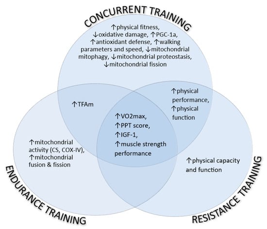 - Lippi, L.; de Sire, A.; Mezian, K.; Curci, C.; Perrero, L.; Turco, A.; Andaloro, S.; Ammendolia, A.; Fusco, N.; Invernizzi, M. Impact of exercise training on muscle mitochondria modifications in older adults: A systematic review of randomized controlled trials. Aging Clin. Exp. Res. 2022, 34, 1495–1510. [Google Scholar] [CrossRef] [PubMed]