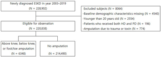 Previous studies have examined the major risk factors for LEA in patients with ESKD [13,14]. However, there is limited research on the major risk factors for all levels of LEA, such as above-knee (AK), below-knee (BK), and foot/toe (FT) amputation, in such patients with a single criterion and a large sample size over an extended period. Moreover, there are substantial disparities worldwide in the incidence of each RRT modality, including hemodialysis (HD), peritoneal dialysis (PD), and kidney transplantation (KT) [15], as well as the incidence of each level of LEA, including the total (AK, BK, and FT), major (AK and BK), and minor (FT) levels [16]. These disparities highlight the need for detailed investigations into the level of LEA and RRT modalities. Therefore, we aimed to investigate the risk factors for LEA in patients with ESKD and major comorbidities, at all levels of LEA (AK, BK, and FT) and in all modalities of RRT (HD, PD, and KT), by analyzing data from the Korean National Health Insurance Service (KNHIS).