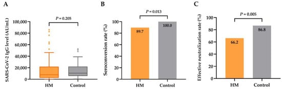 Serological responses to booster vaccines among patients with hematologic malignancies (HMs) (n = 68) and sex- and age-matched healthy control subjects (n = 68). (A) SARS-CoV-2-IgG spike antibody levels in patients and healthy controls. (B) Seroconversion rate in patients and healthy controls. (C) Rate of effective neutralization (SARS-CoV-2 IgG level ≥ 4160 AU/mL) in patients and healthy controls.