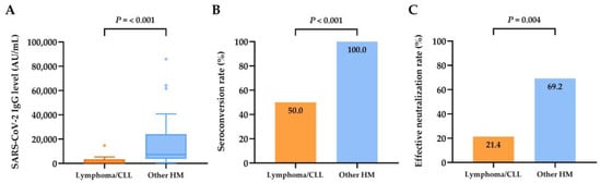 Serological responses of patients with actively treated hematologic malignancies (n = 40). (A) SARS-CoV-2-IgG spike antibody levels in patients with actively treated lymphoma/chronic lymphocytic leukemia (CLL) (n = 14) and other hematologic malignancies (HMs) (n = 26). (B) Seroconversion rate in patients with actively treated lymphoma/CLL (n = 14) and other HMs (n = 26). (C) Rate of effective neutralization (SARS-CoV-2 IgG level ≥ 4160 AU/mL) in patients with actively treated lymphoma/CLL (n = 14) and other HMs (n = 26).