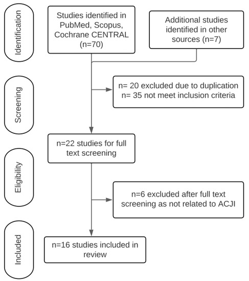 A total of 70 studies were selected from PubMed, Cochrane Central Register of Controlled Trials and Scopus. An additional manual search provided 7 studies. After removing the duplicates and other studies that did not fulfill the eligibility criteria, a total of 16 studies were selected for this review (Figure 2).