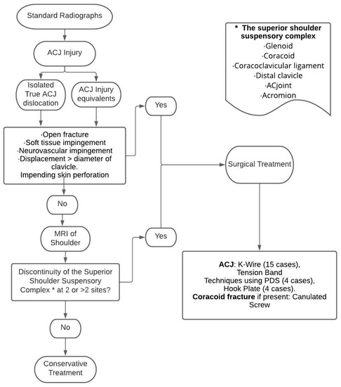Management Algorithm based on the findings of this review. ACJ: Acromioclavicular joint. * Superior Shoulder Suspensory Complex: Glenoid, Coracoid, Coracoclavicular ligaments, distal Clavicle, Acromioclavicular (AC) joint, Acromion.
