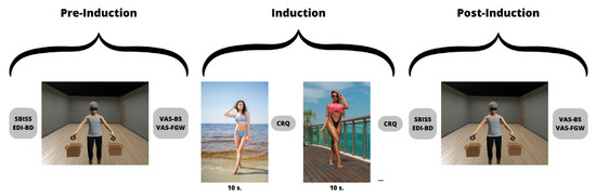 The Research Ethics Committee of the University of Barcelona approved the experimental protocol of this study, and written informed consent was obtained from all participants prior to the study. The researcher provided a cover story to the participants regarding the nature of this study in order to avoid interfering with the results. They explained that this study focused on body image on Instagram and involved a sustained attention task in VR. Once the session was completed, the participants were given accurate information regarding the true purpose of this study. The researcher explored by interview the presence of exclusion criteria and measured the weight and height of the participants to calculate their BMI. Two photos (frontal and lateral) were taken to create the participant’s avatar that accurately represented the participant’s silhouette. Figure 1 shows the general procedure of the experiment, with the appearance of the participant’s avatar, as well as an example of the photographs used during the induction of body dissatisfaction.