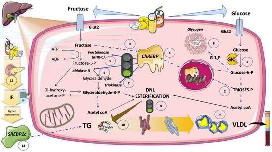 - Iizuka, K. Recent Progress on Fructose Metabolism-Chrebp, Fructolysis, and Polyol Pathway. Nutrients 2023, 15, 1778. [Google Scholar] [CrossRef]