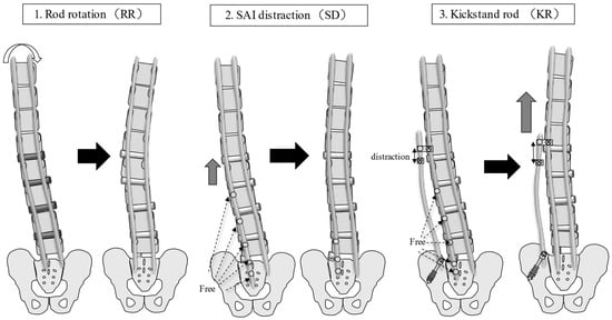 Corrective measures for CI. RR entails the conversion of lumbar lordosis into scoliosis by rotating the two main rods; the main curve remains, and the coronal balance is corrected. SD entails tilting the coronal balance to the opposite side by lifting the main rod on the side, where the coronal balance is tilted cranially using the SAI screw head as a fulcrum. KR entails shifting the coronal balance to the opposite side by shifting the main rod to the cranial side using the additional rod connected to the additional iliac screw as a fulcrum. CI: coronal imbalance; RR: rod rotation technique; SD: sacral alar-iliac screw distraction technique; KR: kickstand rod technique; SAI: sacral alar-iliac screw.