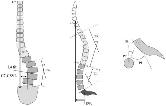 - Zhang, J.; Wang, Z.; Chi, P.; Chi, C. Orientation of L4 coronal tilt relative to C7 plumb line as a predictor for postoperative coronal imbalance in patients with degenerative lumbar scoliosis. Sci. Rep. 2020, 10, 16148. [Google Scholar] [CrossRef] [PubMed]