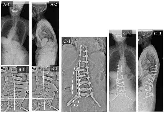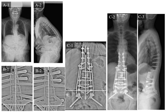 Case study 2 (RR and SD). (A-1) Preoperative standing whole spine radiograph (AP). (A-2) Preoperative standing lateral whole spine radiograph. (B-1) Intraoperative radiograph before RR. (B-2) Intraoperative radiograph after RR. (B-3) Intraoperative radiograph after SD. (C-1) Postoperative radiograph (AP). (C-2) Postoperative standing whole spine radiograph (AP). (C-3) Postoperative standing lateral whole spine radiograph. RR: rod rotation, SD: sacral alar-iliac screw distraction technique.