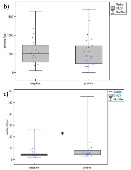 - Singh, B.; Merchant, P.; Walker, C.R.; Kryworuchko, M.; Diaz-Mitoma, F. Interleukin-6 expression in cord blood of patients with clinical chorioamnionitis. Pediatr. Res. 1996, 39, 976–979. [Google Scholar] [CrossRef] [PubMed][Green Version]