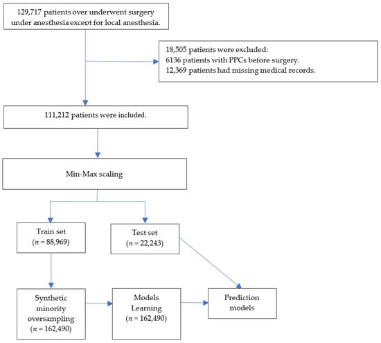 The area of prediction of PPCs using AI has been extended. Recent studies have demonstrated the emergence of a new paradigm. However, previous studies were limited to specific groups or pulmonary diseases. Peng et al. conducted a multicenter study that focused on geriatric patients and utilized a deep neural network model to predict PPCs [7]. Although it provides valuable insights into a specific patient population, its generalizability to other age groups and surgical specialties remains uncertain. Xue et al. developed a model using preoperative and intraoperative data to identify the risk of postoperative pneumonia [8]. Their study investigated the use of ML to predict various postoperative complications, including pneumonia, among PPCs. However, they did not specifically highlight the distinct characteristics and risk factors associated with PPCs other than pneumonia, which potentially diluted the focus on PPCs. Xue et al. focused on predicting pulmonary complications, specifically in emergency gastrointestinal surgery [9]. However, this study did not explore the broader landscape of PPCs across different surgical procedures and settings.