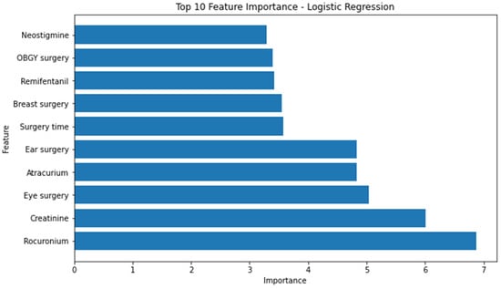 Using the built-in function, we obtained the feature importance of each model except the MLP model. The ten most significant attributes extracted from the logistic regression model, characterized by the highest area under the receiver-operating characteristic curve (AUROC), encompassed the following variables: rocuronium, creatinine, eye surgery, atracurium, ear surgery, duration of surgery, breast surgery, administration of remifentanil, obstetrics and gynecology surgery, and administration of neostigmine (Figure 2).