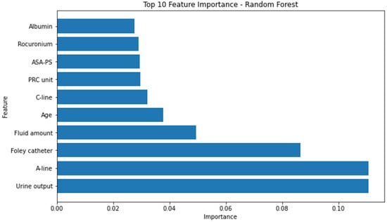 Conversely, the attributes identified as the most influential within the random forest model, as determined by the highest F1 score, consisted of the following factors: urine output, utilization of arterial continuous monitoring line, presence of foley catheter, volume of administered fluids, patient age, employment of central venous pressure monitoring line, transfusion of packed red blood cells, American Society of Anesthesiologists physical status classification, administration of rocuronium, and serum albumin levels. (Figure 3) The significance of the arterial continuous monitoring line stood out conspicuously in comparison to other attributes within the XG boosting model. Notably, albumin, sodium, and potassium, among others, emerged as pivotal features in the light-gradient boosting machine. A comprehensive overview of the feature importance rankings for both the XG boosting and light-gradient boosting machine models is provided in Appendix A and Appendix B, respectively.