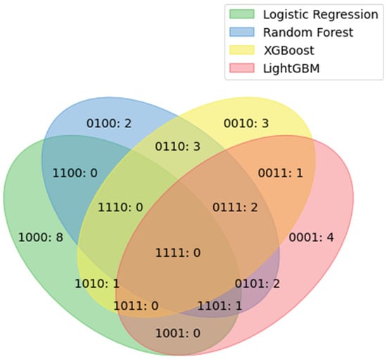 Duplicated features among the top 10 important features of each model. The four numbers represent the logistic regression, random forest, XG boosting, and LGBM models, respectively, in order from the beginning. Zero indicates none, and 1 indicates present. 1101: rocuronium; 0111: urine output and PRC unit. LGBM = light-gradient boosting machine, XG = extreme gradient, PRC = packed red cell.
