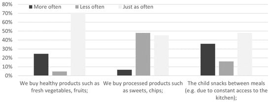 According to the study by Gotler et al. [21], 60.4% of 6- to 10-year-olds admitted to having more snacks per day during the pandemic, of which 19.4% admitted to having more than three additional meals, while in our study, 35.8% of respondents reported snacking between meals more frequently, and 16.0% less often than before the pandemic. In Gotler et al.’s study, 18.9% of participants drank sugary/carbonated/juices/soda more frequently between meals during the COVID-19 lockdown, while in our research, only 3.8% confirmed such an adverse change in eating habits [21]. Restrictions on purchasing snacks and sugary drinks in our survey may be due to limited shopping funds because of reductions in family income after a year of the pandemic, but we did not investigate this particular aspect.