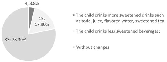 Nearly 78% of the respondents did not notice a change in the consumption of beverages by children during the day, and according to the guardians, 17.9% of children drank less sweetened beverages (Figure 2).