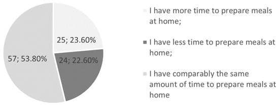The present study also examined the data on preparing meals at home (Figure 3). Overall, 23.6% answered that they had more time to prepare home-cooked meals; a different opinion was shared by a similar group totaling 22.6% of those examined.