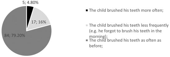 A relatively small percentage of parents (15.1%) changed their habit of supervising the correctness of brushing their children’s teeth, reporting more or less frequent supervision. Almost half of the examined group (47.2%) supervised oral hygiene as often as before. A relatively large subgroup (37.7%) of respondents reported that children always brushed their teeth on their own, without parental supervision.