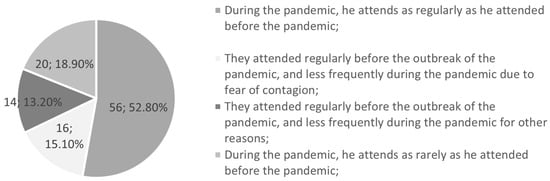 In the third part of the survey, guardians were asked about their attitude to dental visits during the pandemic (Figure 5). Overall, 71.7% said they had not changed the frequency of dental check-ups for their children: they visited the surgery equally regularly or equally rarely at 52.8% and 18.9%, respectively. Most guardians (52.8%) believed that their visits were similarly frequent, while 28.3% declared a lower frequency of visits to the dentist since the outbreak of the pandemic for two main reasons: fear of coronavirus transmission—chosen by 15.1% of respondents—and for other reasons, e.g., economic, selected by 13.2% of respondents.