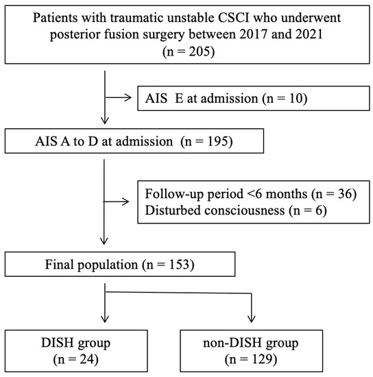 Flowchart of patient selection. AIS, American Spinal Injury Association Impairment Scale; CSCI, cervical spinal cord injury; DISH, diffuse idiopathic skeletal hyperostosis.