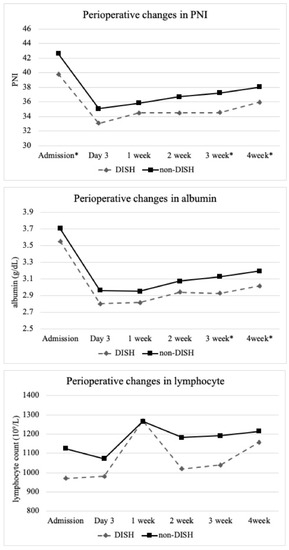Perioperative changes in prognostic nutritional index (PNI), serum albumin, and lymphocyte count. DISH, diffuse idiopathic skeletal hyperostosis; * statistically significant difference (p < 0.05).