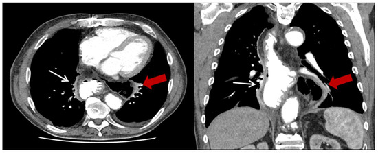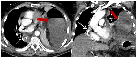 Exemplary CT-scan of an incarcerated hiatal hernia on the left thoracic side with a clear mediastinal shift to the right. Gastric conduit marked with thin white arrow; herniated colon marked with thick red arrow.