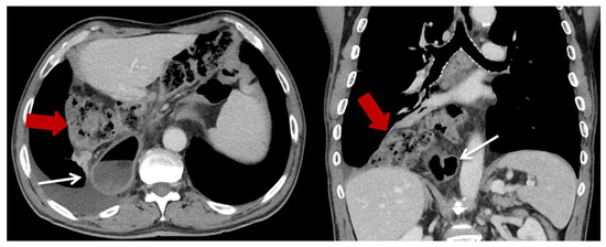 Exemplary CT-scan of a hiatal hernia on the right thoracic side after HMIE. Gastric conduit marked with thin white arrow; herniated colon marked with thick red arrow.