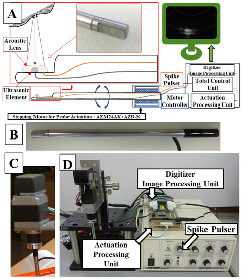 A system schema (A) of the manufactured probe (orange line: acoustic pulse line, black line: signal line from the ultrasonic element to the digitizer), a photograph (B) of the actual probe, a stepping motor (C) for controlling rotation of the probe, and an overall mechanism diagram (D).