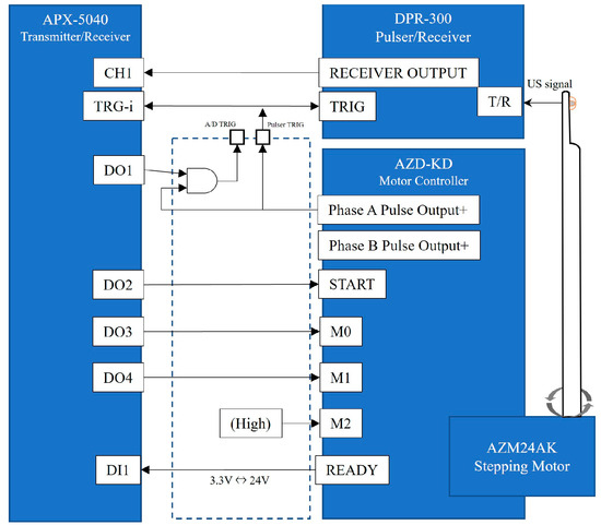 A detailed system block diagram. The AZD-KD motor controller can execute motions with multiple motion modes, origins, and speeds set in advance by inputting signals to M0, M1, and M2. M0 and M1 were controlled from the APX-5040 digital output channel, D03 and D04, and M2 were fixed at a high level. START/READY on AZD-KD are a signal to notify the start/completion of motion. In this experiment, the registered motion settings of AZD-KD were set to reciprocate between angles −45° and 45° at a speed of 5000 r/min.
