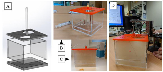 A computer aided design (CAD) model of the mold for the agar phantom. Lids have a width of 142 mm, a length of 142 mm, and a height of 100 mm, each having a diameter of 7 mm and having 14 holes each for passing tissue on a diagonal line at intervals of 10 mm on the lid. A hole of 15 mm diameter is made in the center of the top lid for inserting the probe (A); an actual molded plastic mold. Nerves and blood vessels can be fixed here. A tube is connected from a syringe to maintain the lumen of the blood vessel, and the vessel is filled with physiological saline (B); and the agar dissolved therein is cooled to 40 °C and poured and solidified (C); and finally physiological saline is put into the central hole, and an ultrasonic probe is inserted and observed (D). Please find the Supplementary Video S1.