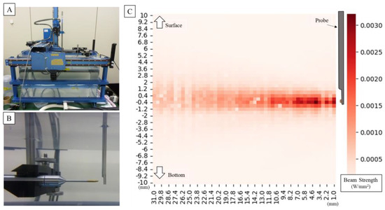 Setting of underwater acoustic intensity measuring device (A). It is measured in pure water at room temperature. The hydrophone moves as it measures around the probe (B). The image below shows the measured amplitude overlaid on a photo. Graph plotting ultrasonic intensity around the probe (for the first measurement) (C); the waveform remains almost the same for all three measurements. The intensity distribution is uniform around the probe, and the strongest point shows sufficient intensity for an ultrasonic measurement probe.