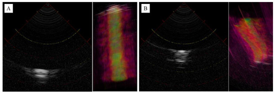Figure 5A shows an image of a blood vessel. A representative slice of the central vertical axis was then extracted. Low-intensity luminal structures were observed within the high-intensity outer luminal structures. The overall internal structure was of low resolution, although a high contrast was observed due to the water filling the vessel lumen. However, the distance between the probe and the vessel thickness can be accurately determined. Figure 5B shows an image of the ulnar nerve. Representative slices from the longitudinal central region were extracted. As a result of the low resolution, it was difficult to visualize the outer membrane structure, but the funicular structure originating from the inner nerve bundle was barely visible. As with blood vessels, the distance from the probe and the thickness of the nerve can be accurately depicted. The 3D reconstructed images are shown on the right side of each image, and the slices were reconstructed with little two-dimensional displacement due to the vertical movement.