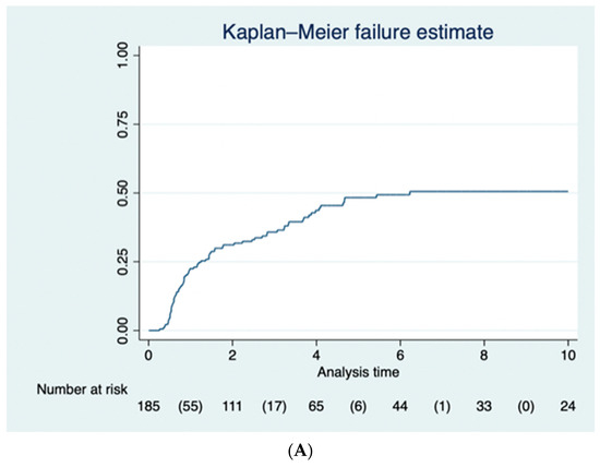 Eighty-nine of the one hundred and ninety-two (46.3%) patients underwent proctectomy over the follow-up period: eight patients (4.2%) underwent panproctocolectomy, and eighty-one (42.1%) underwent proctectomy at a later date. The proportion of patients who had a proctectomy was 25.1% (95% CI 19.9–32.3%) at 1 year, 33.1% (95% CI 27.7–41.3%) at 2 years, 37.6% (95% CI 31.8–46.0%) at 3 years, 45.1% (95% CI 38.7–53.8%) at 4 years, 49.6% (95% CI 42.7–58.4%) at 5 years, and 51.8% (95% CI 44.7–60.8%) at 10 years after subtotal colectomy (Figure 1A). Reasons for proctectomy included persistence of symptoms after subtotal colectomy or wishing to avoid the need for long-term endoscopic surveillance in 70 patients (79%), acute exacerbation of ulcerative colitis in 16 patients (18%) and dysplasia in 3 patients (3%).