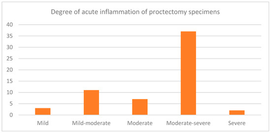A bar graph demonstrating the proportions of proctectomy specimens with varying degrees of acute inflammation. Sixty of the eighty-nine proctectomy specimens (67.4%) showed active inflammation in the residual rectum, of which three were mild, eleven were mild to moderate, seven were moderate, thirty-seven were moderate to severe, and two were severe.