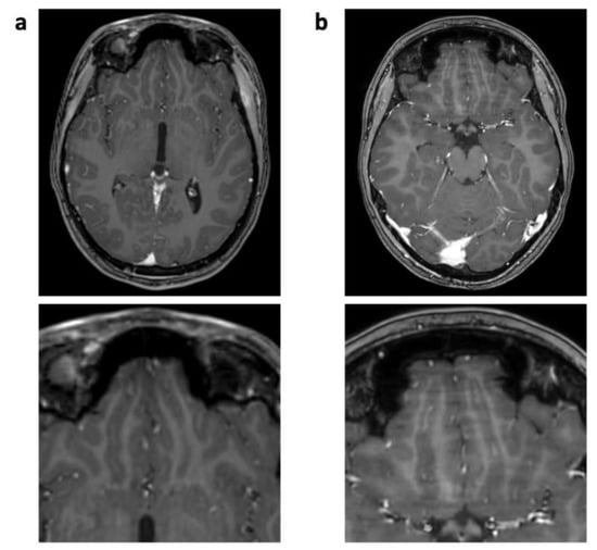 Enhanced 3D T1 TFE images of an 18-year-old male patient with ganglioglioma (not shown). Reconstruction artifact with thin oblique geometrical streaks is seen in SENSE 3D T1 TFE ((a), post-surgery); not present in CS 3D T1 TFE (b). White box indicates magnification.