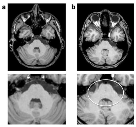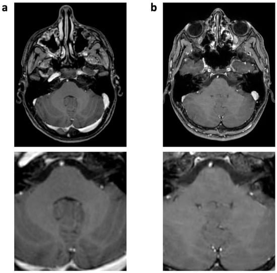 Enhanced 3D T1 TFE images of a 12-year-old male patient with non-germinomatous germ cell tumor (not shown). Wax-layer artifact presenting as patchy to blurred signal inhomogeneity in the pons and cerebellum in CS (b); not present in previous SENSE study (a).